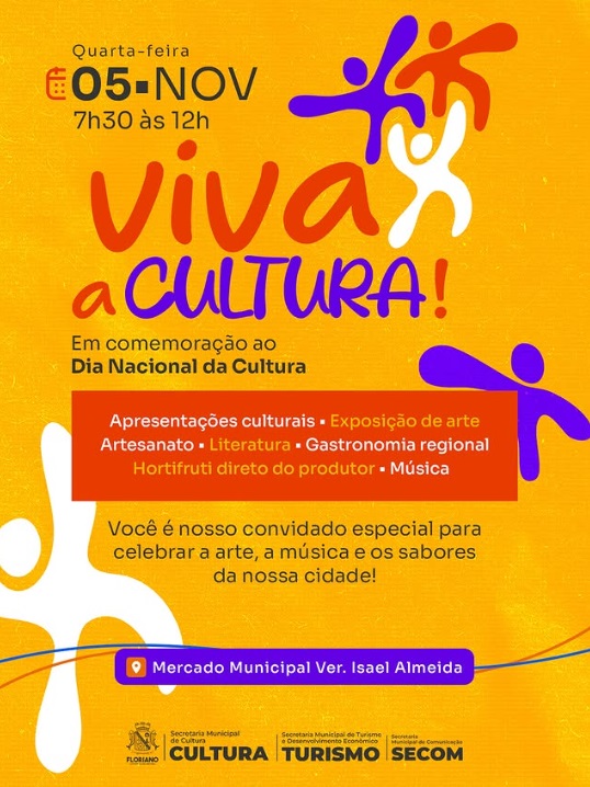 Floriano celebrará o Dia Nacional da Cultura com arte, música e sabores regionais.A cidade de Floriano vai celebrar o Dia Nacional da Cultura em grande estilo! Nesta quarta-feira, 05 de novembro, o Mercado Municipal Ver. Isael Almeida será palco de uma manhã repleta de arte, música e tradições locais.