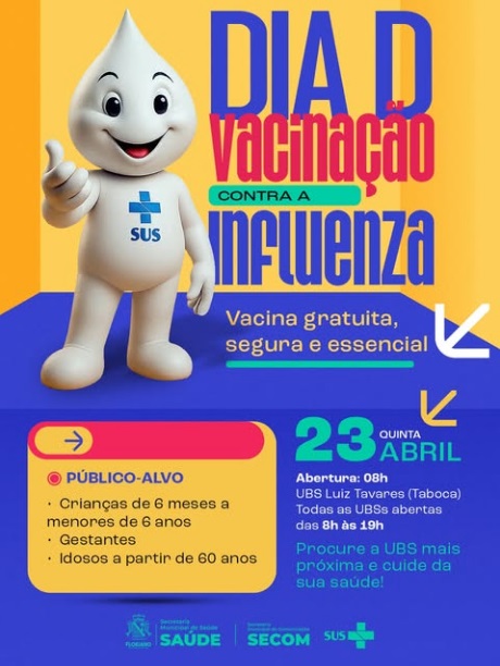 Floriano realiza Dia D de Vacinação contra a Influenza no dia 23 de abril.A Prefeitura de Floriano promoverá, na próxima quinta-feira, 23 de abril, o Dia D de Vacinação contra a Influenza, com o objetivo de ampliar a cobertura vacinal e proteger a população contra o vírus da gripe.